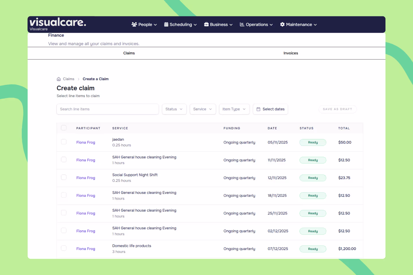 Learn MoreWhen rosters, evidence, and service categories align, your finance team receives clean data. Visualcare supports SAH exporting direct to Services Australia via a direct API. Which means you can stay on top of your cash flow.